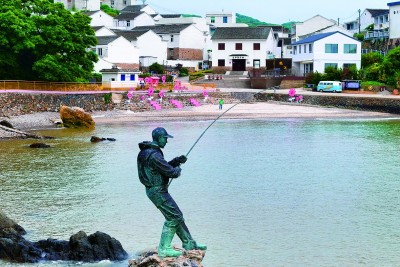 在浙江省舟山市普陀区白沙岛,一座海钓主题铜像矗立在海边。