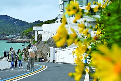 在浙江省舟山市嵊泗县嵊山岛,游客在民宿花墙前打卡拍照。