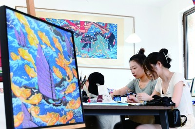 在浙江省舟山市普陀区葫芦岛,游客体验传统渔民画。